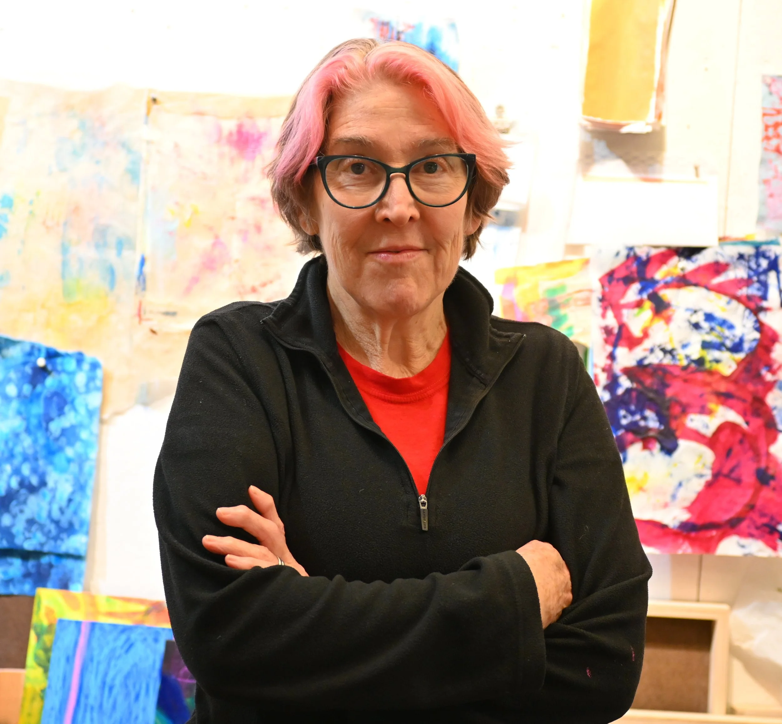 Boston-based artist Alison Darrow (b. 1951) started as an illustrator, then studied painting at Bard College. She has pursued an autodidact’s MFA ever since, exploring narrative illustration, relief printmaking, and ceramics. After more than 20 years in corporate deserts, in 2016 she returned to painting, using paint and pixels to explore abstraction. Carrie Moyer, Charline Von Heyl, and Simon Williams are among her heroes.